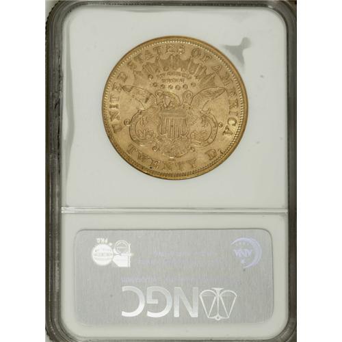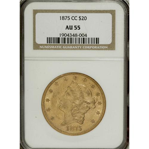 <B>1875-CC $20 AU55 NGC.</B></I> This well defined representative retains substantial glowing mint luster, and both sides are pleasantly free from bagmarks. A worthwhile addition to a Carson City gold type collection.<BR><BR><b>Shipping:</b> Coins & Currency (<a target="_blank" href="http://www.heritageauctions.com/common/shipping.php">view shipping information</a>)