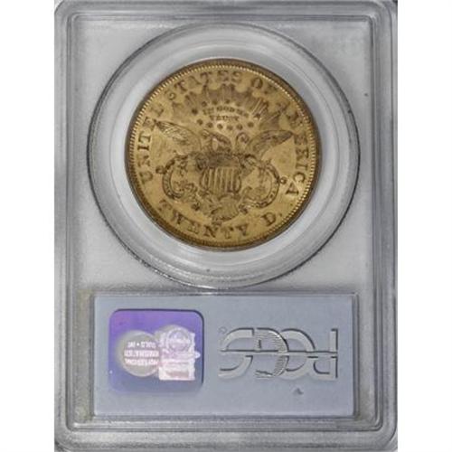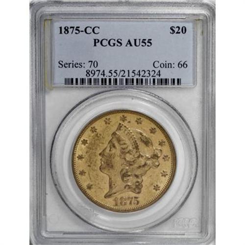 <B>1875-CC $20 AU55 PCGS.</B></I> An original Carson City twenty with plentiful luminous luster. The fields are only moderately abraded, although the cheek has a few conspicuous marks.<BR><BR><b>Shipping:</b> Coins & Currency (<a target="_blank" href="http://www.heritageauctions.com/common/shipping.php">view shipping information</a>)