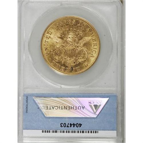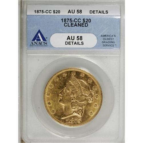 <B>1875-CC $20 AU58 ANACS. AU58 Details.</B></I> A bright example with perhaps unnatural reflectivity in the fields. The devices are semi-frosted and the overall look is attractive. A mark below Liberty's eye on the obverse is noted as is a bit of verdigris near the mint mark on the reverse. An always-popular Carson City issue.<BR><BR><B>Coin Engraver:</B> James B. Longacre<BR><BR><b>Shipping:</b> Coins & Currency (<a target="_blank" href="http://www.heritageauctions.com/common/shipping.php">view shipping information</a>)
