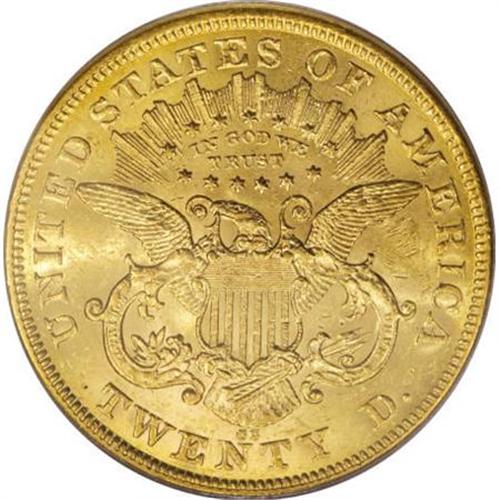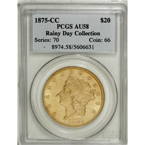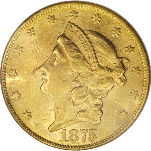<B>1875-CC $20 AU58 PCGS.</B></I> Ex: Rainy Day Collection. The perfect piece for the collector seeking an affordable, attractive Carson City double eagle, this near-Mint beauty offers gorgeous canary-gold color, strong detail, and excellent visual appeal. Only a touch of friction is apparent on the highpoints, and the fields show just faint, scattered abrasions.<BR><BR><B>Coin Engraver:</B> James B. Longacre<BR><BR><b>Shipping:</b> Coins & Currency (<a target="_blank" href="http://www.heritageauctions.com/common/shipping.php">view shipping information</a>\)