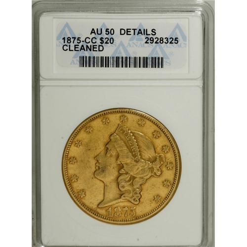 <B>1875-CC $20 --Cleaned--ANACS. AU50 Details.</B></I> Variety 1-A. The obverse is glossy, while the yellow-orange reverse has subdued luster. Several moderate abrasions are present on the cheek.<BR><BR><b>Shipping:</b> Coins & Currency (<a target="_blank" href="http://www.heritageauctions.com/common/shipping.php">view shipping information</a>)