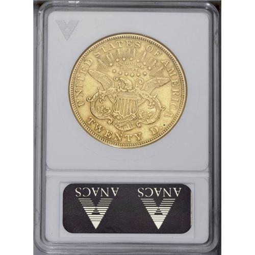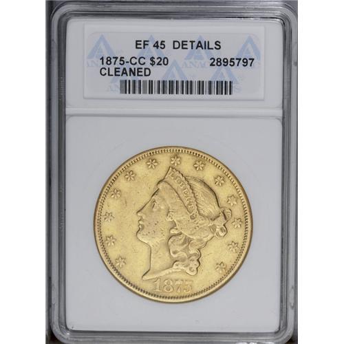 <B>1875-CC<$20>--Cleaned--ANACS. XF45 Details.</B></I> Minor wear combines with a soft strike to give this piece a low-detail appearance. Hints of original luster are still visible beneath the uniform brightness that defines this yellow-gold double eagle.
