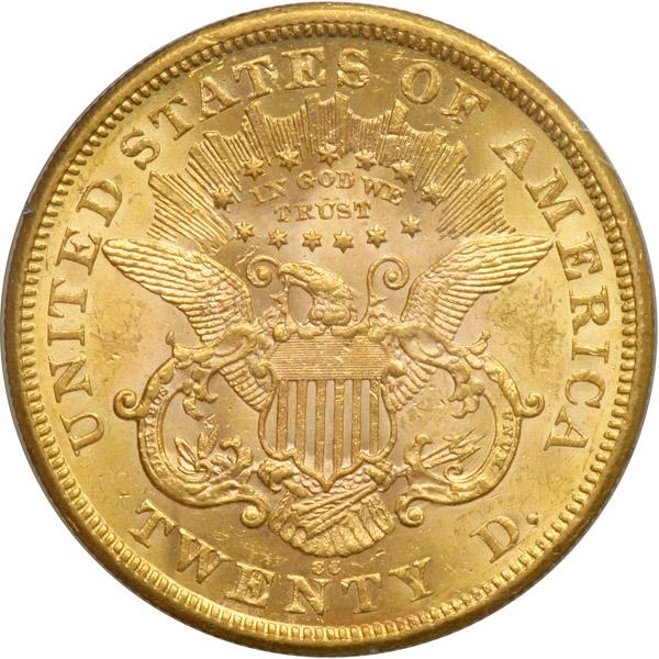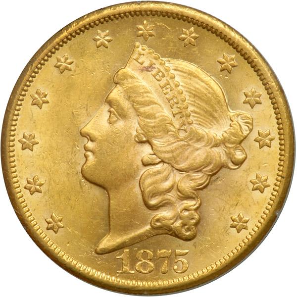 1875-CC $20 Liberty. PCGS graded MS-61 PQ. Housed in a First Generation Holder. Lovely golden toning. A nice frosty example. Although the 1875-CC is the most easily obtainable Carson City double eagle struck in the Type Two series, this applies mainly to circulated grades. In Mint condition, however, infrequent encounters are the norm. The mint luster is bright with some cartwheel effects still evident, while the surfaces display vibrant golden tints overlaid by some pale golden-orange hues. Sharply struck throughout. Very few abrasions occur; there are so few of them on the obverse that this side is especially beautiful. For its part, the reverse has a few random bagmarks on the shield and around TWENTY, but all in all the surface compares favorably with a coin in higher grade. An obvious opportunity for Double Eagle collectors, but an equally important occasion for a collector assembling a special-order Type set. The reverse of this example has a small, bold mintmark starting over the right serif of N, and without any of the usual intermittent cracks in the legends (PCGS # 8974) .