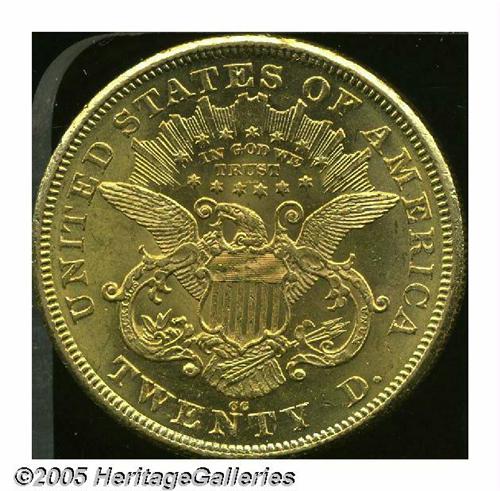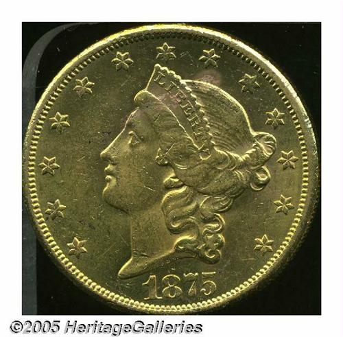 <B>1875-CC<$20> MS60 Cleaned, Environmental Damage Uncertified.</B></I> Well struck with pleasing details and rich toning. Wispy hairlines confirm an improper cleaning, at some point in the past, and light corrosion on the upper obverse is probably the result of environmental damage.