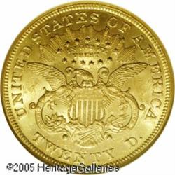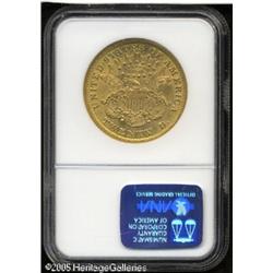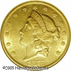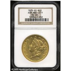 <B>1875-CC $20 MS60 NGC.</B></I> Ex: Ashland City Collection. Winter 1-A. More plentiful than the 1874-CC in high grades, the 1875-CC (111,151 pieces produced) is often used to represent Type Two Double Eagle production at the Carson City Mint. This Brilliant Uncirculated survivor is exceptionally well struck, especially on the reverse. The surfaces display scattered, mostly small abrasions, but the outward appearance is noteworthy for an issue whose survivors are often plagued by sizeable distractions and/or numerous alloy spots. Well frosted within the context of the MS60 grade level, with rich orange-gold color.<BR><I>Ex: 2003 FUN Signature Sale (Heritage 1/03).</B></I><BR><I>From The Richard J. Chouinard Collection of United States Coins, Part Two.</B></I> Lot:9104