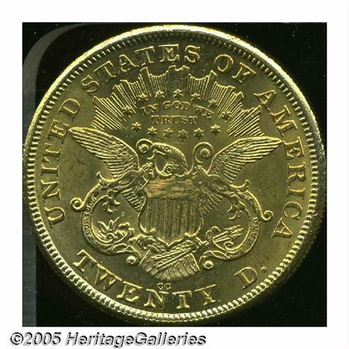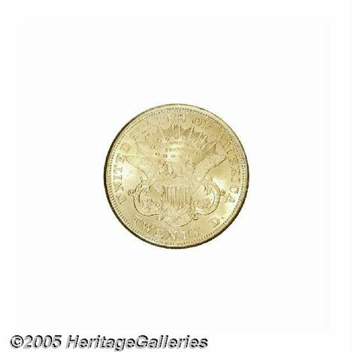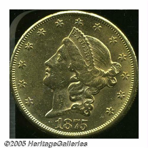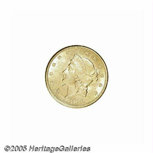 <B>1875-CC<$20> MS61 Cleaned, Uncertified.</B></I> Lustrous in the fields and sharp. The surfaces show scattered handling marks attendant to these large gold coins, including a few on Liberty's face. There is a minor drift mark in the field between the first star and Liberty's chin. Despite the cleaning, this is still an attractive example for the date collector.