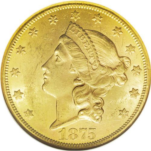 <B>1875-CC $20 MS61 NGC.</B></I> Apricot-gold surfaces display generally well impressed design elements, except for some softness in Liberty's hair and on a couple of the star centrils. The luster is somewhat soft, and several minute contact marks and scuffs are scattered about. One of the more available Carson City issues.<BR><BR><b>Shipping:</b> Coin/Currency (<a target="_blank" href="http://www.heritageauctions.com/common/shipping.php">view shipping information</a>)