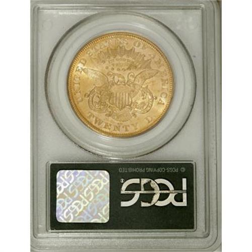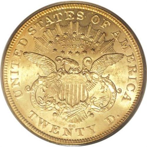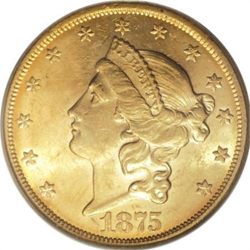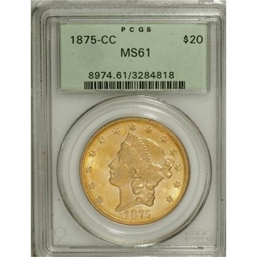 <B>1875-CC $20 MS61 PCGS.</B></I> The reverse of this lustrous and attentively struck CC-mint Type Two twenty is remarkably free from scuffs. The left obverse is somewhat abraded, but the orange-gold toning leads to pleasing eye appeal. The portrait highpoints display subtle ice-blue patina. Encapsulated in a green label holder.<BR><BR><b>Shipping:</b> Coins & Currency (<a target="_blank" href="http://www.heritageauctions.com/common/shipping.php">view shipping information</a>)