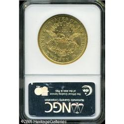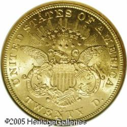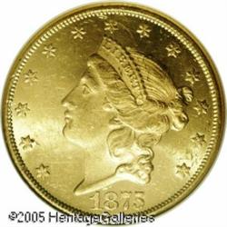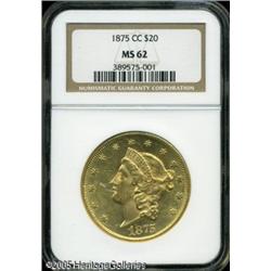 <B>1875-CC $20 MS62 NGC.</B></I> A little scuffy but showing vibrant mint frost with an underlying satiny appearance in the fields. Especially popular as one of the more obtainable Carson City issues in Mint State. Rare in finer grades. Population: 146 in 62, 23 finer (1/05). Lot:9108