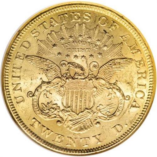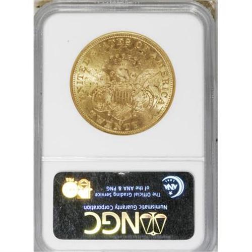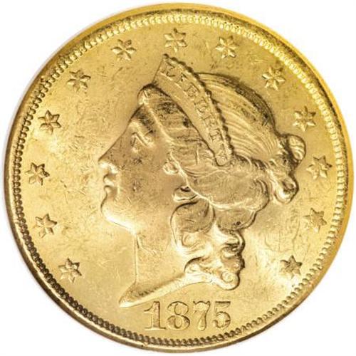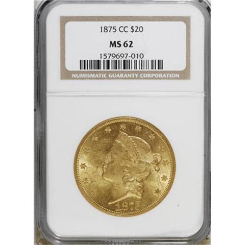 <B>1875-CC $20 MS62 NGC.</B></I> Fully brilliant and lustrous yellow-gold with exceptional eye appeal and sharp design definition. A lovely piece for the grade, and seldom found any nicer. NGC has only graded 28 coins at higher levels (1/08). Although considered a common Type Two issue, the 1875-CC double eagle is a true condition rarity, even at the MS62 level.<BR><BR><B>Coin Engraver:</B> James B. Longacre<BR><BR><b>Shipping:</b> Coins & Currency (<a target="_blank" href="http://www.heritageauctions.com/common/shipping.php">view shipping information</a>)