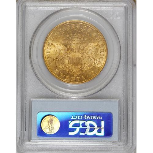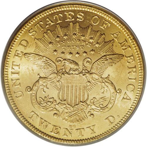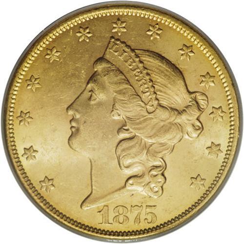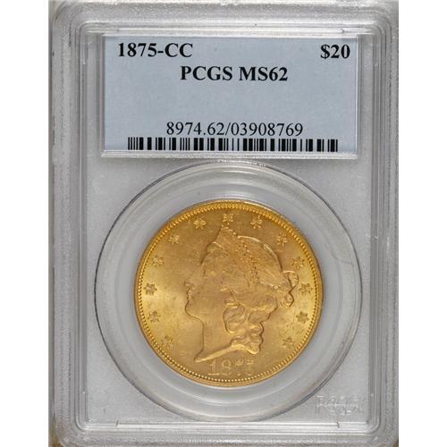 <B>1875-CC $20 MS62 PCGS.</B></I> An abundant issue in lower grades, but scarce in MS62 and MS63, according to Garrett and Guth. This piece offers a premium appearance, with lovely orange-gold surfaces covered with luster. The strike is sharp, and the few light abrasions are grade-consistent. A nice one! PCGS has graded 24 pieces finer (4/07).<BR><BR><b>Shipping:</b> Coins & Currency (<a target="_blank" href="http://www.heritageauctions.com/common/shipping.php">view shipping information</a>)