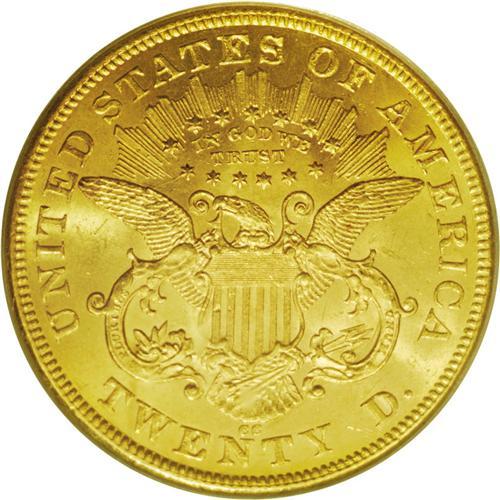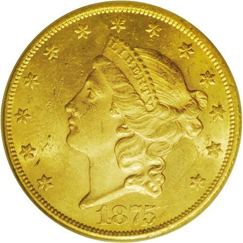 <B>1875-CC<$20> MS62 PCGS.</B></I> The 1875-CC has a mintage of more than 111,000 pieces, and is the most obtainable Carson City double eagle in Mint State from the 1870s. The example in this lot displays lustrous apricot-gold surfaces imbued with light green undertones. The strike is sharp, other than softness on Liberty's hair. Minute scattered marks, especially on the obverse, define the grade.