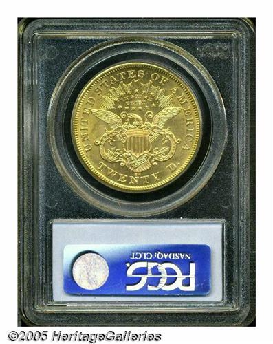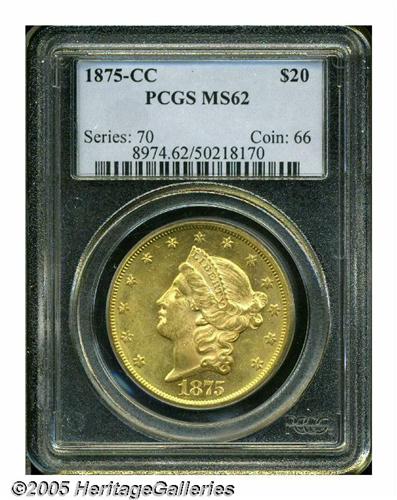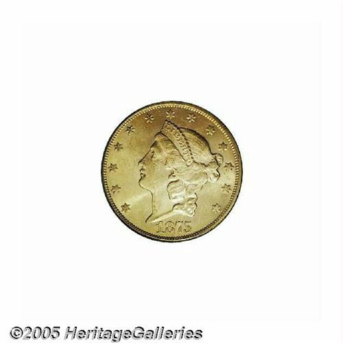 <B>1875-CC<$20> MS62 PCGS.</B></I> The third most common CC-mint Double Eagle, the 1875-CC is, however, a conditionally elusive issue. This coin's moderately abraded, yet lustrous surfaces are difficult to beat in today's market. The color is original yellow-gold in shade.