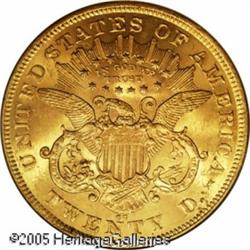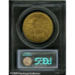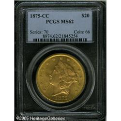 <B>1875-CC $20 MS62 PCGS.</B></I> Typically well struck with a soft, frosted luster that proves very compatible with delicate orange accents. This issue's obtainability in Uncirculated grades, as well as its Carson City origins, make for a very popular issue. Lot:9109