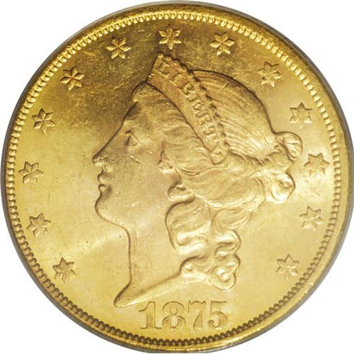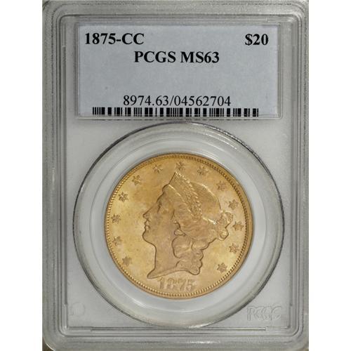 <B>1875-CC $20 MS63 PCGS.</B></I> The 1874-CC and 1875-CC double eagle issues were produced to the extent of more than 100,000 pieces each, so that examples are available up to the lower Mint State grades. The 1874-CC is seldom seen above MS60, however, and the 1875-CC is elusive above MS61. In MS63, NGC and PCGS combined have certified only about four dozen coins, almost assuredly including numerous duplications. This richly colored example offers orange-gold surfaces with some field-device contrast, good eye appeal, and few singular abrasions. A nice one for the Carson City aficionados.<BR><I>From The Kutasi Collection.</B></I><BR><BR><b>Shipping:</b> Coin/Currency (<a target="_blank" href="http://www.heritageauctions.com/common/shipping.php">view shipping information</a>)