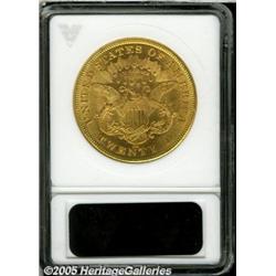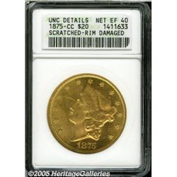 <B>1875-CC $20 --Scratched, Rim Damaged--ANACS. Unc Details, Net XF40.</B></I> A long scratch is observed in the left obverse field, and the obverse rim is bruised at 7 o'clock.