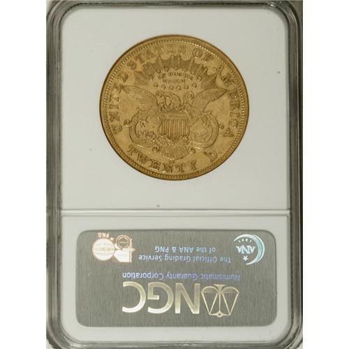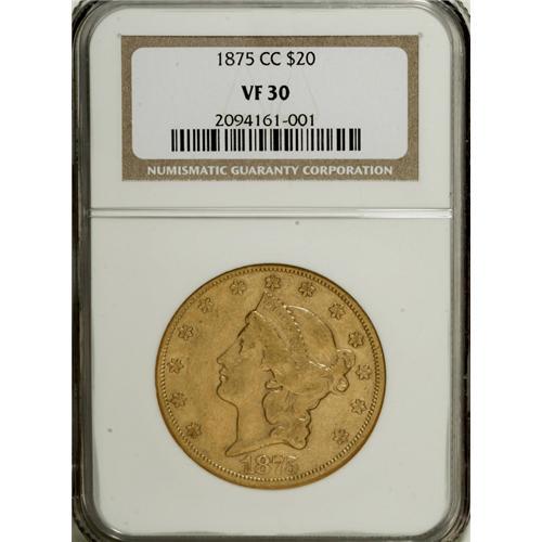 <B>1875-CC $20 VF30 NGC.</B></I> Light wear is present on each side of this medium yellow-gold piece. Apparent doubling on the reverse, especially at TWENTY D., appears to be strike doubling rather than die doubling.<BR><BR><b>Shipping:</b> Coins & Currency (<a target="_blank" href="http://www.heritageauctions.com/common/shipping.php">view shipping information</a>)