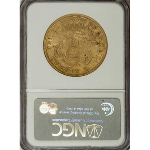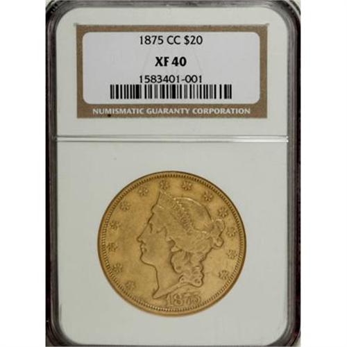<B>1875-CC $20 XF40 NGC.</B></I> A pleasing and comparatively affordable example of a Carson City double eagle, this mustard-gold XF piece shows light, even wear and a degree of peripheral luster. While a number of copper spots are noted at the right reverse, the obverse displays wonderfully. Minimally marked with substantial visual appeal for the grade.<BR><BR><B>Coin Engraver:</B> James B. Longacre<BR><BR><b>Shipping:</b> Coins & Currency (<a target="_blank" href="http://www.heritageauctions.com/common/shipping.php">view shipping information</a>\)