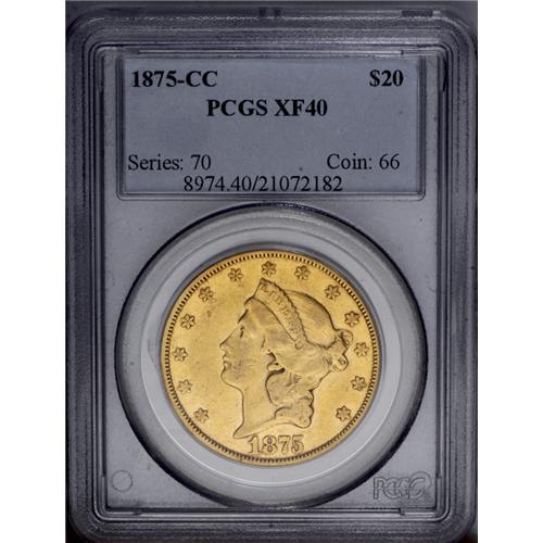 <B>1875-CC<$20> XF40 PCGS.</B></I> The typical 1875-CC is a strong candidate to represent the Type Two Double Eagle series in a type collection. This pleasing XF representative exhibits green-gold color that deepens to copper hues at the reverse denticles. Mostly small abrasions pepper both sides, all of which are well within the confines of the Extremely Fine grade level.<BR><I>From The Steve Glenn Collection.</B></I> <BR><BR><B>Important notice:</B> Heritage usually auctions material at the rate of 200-250 lots per hour. On some occasions eBay Live bid software or the Internet may not be able to keep up with the pace of the auction. We recommend placing a realistic absentee bid now as insurance to avoid disappointment. Occasionally the auctioneer may eliminate or reject an eBay Live bid, and the auctioneer may also reopen a lot after the close of the eBay live bidding (usually because we missed an audience bid), and may reject your bid even if it shows you as the winning bidder. By bidding via eBay Live, you agree that Heritage may award the lot to another bidder at its sole discretion under the circumstances described above or any other reasonable circumstances. Since eBay bids are not shown to us until we open the lot on the floor, we treat those bids just like floor bids. In most cases the floor responds before the eBay bid is presented to us, due to Internet lag time, so for consistency we have made it a policy that floor bids are always considered first over tie eBay live bids. Also please note that all Heritage lots purchased through eBay Live carry a 20% Buyer's Premium. Please make sure you read the Terms and Conditions before you bid. This lot is being auctioned in conjunction with a live floor auction by Heritage Galleries & Auctioneers. All final auction and invoice information will be supplied by Heritage Galleries & Auctioneers, and all other information should be considered preliminary. Lot:4255 <BR><BR><B>Winning Notification and Billing:</B> After the FINAL session in this auction is complete, Heritage will send e-mail and snail mail invoices. This process normally takes several days. All final auction and invoice information will be supplied by Heritage Galleries & Auctioneers, and all other information should be considered preliminary. <BR><BR>This auction will be conducted on a live auction floor and over the Internet through eBay Live. If you choose to place an absentee bid, please take a moment to <font color='#0000ff'><u><a href='http://pages.ebay.com/liveauctions/help/before/laabsentee.html'>learn how eBay Live absentee bidding works</a></u></font><font color='#000000'>