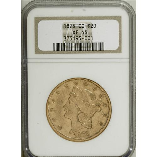 <B>1875-CC $20 XF45 NGC.</B></I> This lightly worn orange-gold example retains a degree of peripheral luster. A well struck example of this more-available Carson City double eagle that has light abrasions overall.<BR><BR><b>Shipping:</b> Coins & Currency (<a target="_blank" href="http://www.heritageauctions.com/common/shipping.php">view shipping information</a>)