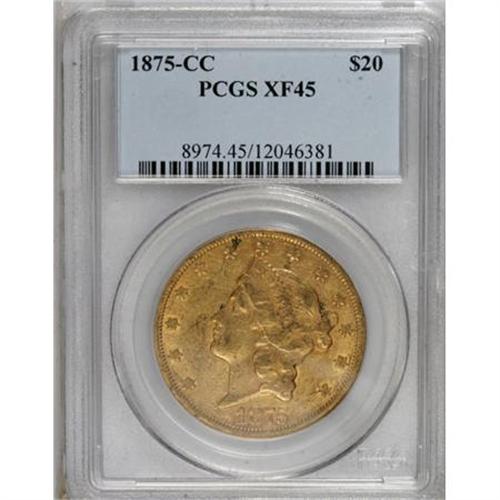 <B>1875-CC $20 XF45 PCGS.</B></I> The collector seeking an affordable Type Two Carson City double eagle should consider the present piece. Significant peripheral luster remains on the dusky orange-gold surfaces, and though the devices show light wear and marks, the overall eye appeal remains strong. A small alloy spot appears near star 6.<BR><BR><B>Coin Engraver:</B> James B. Longacre<BR><BR><b>Shipping:</b> Coins & Currency (<a target="_blank" href="http://www.heritageauctions.com/common/shipping.php">view shipping information</a>)