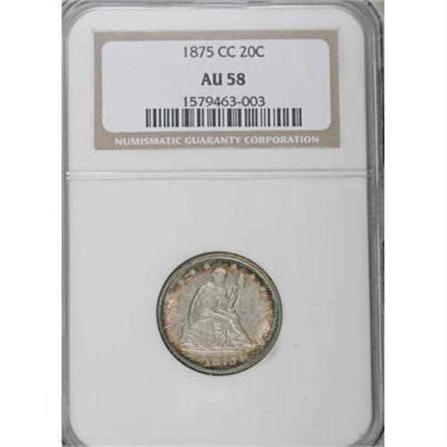 <B>1875-CC 20C AU58 NGC.</B></I> Slivers of cobalt-blue, lavender, and golden-brown patina concentrate at the margins of this lightly circulated Carson City issue. Well struck and minimally abraded.<BR><BR><B>Coin Engraver:</B> William Barber<BR><BR><b>Shipping:</b> Coins & Currency (<a target="_blank" href="http://www.heritageauctions.com/common/shipping.php">view shipping information</a>)