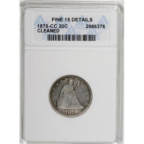 <B>1875-CC 20C --Cleaned--ANACS. Fine 15 Details.</B></I> NGC Census: (5/392). PCGS Population (15/534). Mintage: 133,290. Numismedia Wsl. Price for NGC/PCGS coin in F15: $334. (#5297)<BR><BR><B>Coin Engraver:</B> William Barber<BR><BR><b>Shipping:</b> Coins & Currency (<a target="_blank" href="http://www.heritageauctions.com/common/shipping.php">view shipping information</a>)