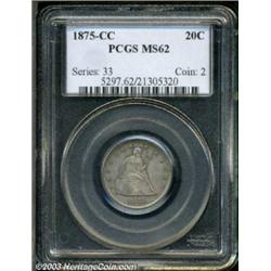 <TABLE cellSpacing=0 cellPadding=0 width="100%" bgColor=#000000 border=0><TBODY><TR><TD width="100%"><TABLE cellSpacing=1 cellPadding=3 width="100%" border=0><TBODY><TR><TD width="100%" bgColor=#79735c><FONT face=arial color=#ffffff size=3><B>Description</B> </FONT></TD></TR><TR><TD width="100%" bgColor=#ffffff><FONT face=arial size=2><B>1875-CC 20C MS62 PCGS.</B></I> The smooth slate-gray surfaces display darker charcoal-gray color near the devices. The strike is bold overall, but somewhat weak on the upper details of the eagle. No marks or abrasions are seen on either side. </FONT></TD></TR></TBODY></TABLE></TD></TR></TBODY></TABLE><BR><A name=PricesRealized></A><TABLE cellSpacing=0 cellPadding=0 width="100%" bgColor=#000000 border=0><TBODY><TR><TD width="100%"><TABLE cellSpacing=1 cellPadding=3 width="100%" border=0><TBODY><TR><TD width="100%" bgColor=#79735c><A name=PR><FONT face=arial color=#ffffff size=3><B>Previous Prices from Heritage Auctions</B> </FONT></A></TD></TR><TR><TD bgColor=#f6f6ed><TABLE cellSpacing=0 cellPadding=0 width="100%" border=1><TBODY><TR><TD align=middle width="33%"><B>Date</B></TD><TD align=middle width="33%"><B>Service</B></TD><TD align=middle width="33%"><B>Price</B></TD></TR><TR bgColor=whitesmoke><TD width="33%"><B>10/01/2001</B></TD><TD width="33%">PCGS</TD><TD width="33%">$1,208.00</TD></TR><TR bgColor=whitesmoke><TD width="33%"><B>04/14/2000</B></TD><TD width="33%">PCGS</TD><TD width="33%">$833.75</TD></TR><TR bgColor=whitesmoke><TD width="33%"><B>09/01/1996</B></TD><TD width="33%">PCGS</TD><TD width="33%">$1,238.00</TD></TR><TR bgColor=whitesmoke><TD width="33%"><B>03/01/1997</B></TD><TD width="33%">PCGS</TD><TD width="33%">$1,320.00</TD></TR><TR bgColor=whitesmoke><TD width="33%"><B>10/06/2001</B></TD><TD width="33%">ANACS</TD><TD width="33%">$1,150.00</TD></TR><TR bgColor=whitesmoke><TD width="33%"><B>07/29/2003</B></TD><TD width="33%">NGC</TD><TD width="33%">$1,092.50</TD></TR></TBODY></TABLE></TD></TR><TR><TD bgColor=#ffffff><FONT face=arial size=1 ?>PLEASE NOTE: All prices realized reflect the final hammer price PLUS the buyer's premium in auctions that charge a buyer's premium. Each item has a notation at the top of the listing indicating whether that lot included a buyer's premium. Example: A item that sells with a final hammer price of $100 and a 20% buyer's premium will display with a price realized of $120. All information listed is intended to be as accurate as possible, but errors are possible. Please use this guide carefully and inform us of any inaccuracies. </FONT></TD></TR></TBODY></TABLE></TD></TR></TBODY></TABLE><BR><TABLE cellSpacing=0 cellPadding=0 width="100%" bgColor=#000000 border=0><TBODY><TR><TD width="100%"><TABLE cellSpacing=1 cellPadding=3 width="100%" border=0><TBODY><TR><TD width="100%" bgColor=#79735c colSpan=6><FONT face=arial color=#ffffff size=3><B>Price Guide*</B> </FONT></TD></TR><TR bgColor=#f6f6ed><TD align=middle><B>Grade</B> </TD><TD align=middle><B>Coin World<BR>(Trends)</B> </TD><TD align=middle><B>Numismedia<BR>Retail</B> </TD><TD align=middle><B>Numismedia<BR>Wholesale</B> </TD><TD align=middle><B>Coin<BR>Universe</B> </TD><TD align=middle><B>Heritage<BR>Value Index</B> </TD></TR><TR bgColor=#ffffff><TD align=middle>61</TD><TD align=right>---</TD><TD align=right>---</TD><TD align=right>$950.00</TD><TD align=right>---</TD><TD align=right>$697.44</TD></TR><TR style="FONT-WEIGHT: bold" bgColor=#cccfdd><TD align=middle>62</TD><TD align=right>$1,200.00</TD><TD align=right>---</TD><TD align=right>$1,050.00</TD><TD align=right>---</TD><TD align=right>$845.29</TD></TR><TR bgColor=#ffffff><TD align=middle>63</TD><TD align=right>$1,800.00</TD><TD align=right>---</TD><TD align=right>$1,250.00</TD><TD align=right>$1,550.00</TD><TD align=right>$1,298.75</TD></TR><TR bgColor=#ffffff><TD colSpan=6><FONT size=1>*All information listed is intended to be as accurate as possible, but errors are possible. No item may be returned or refused based on this information which is provided as a service to our customers. You should contact each pricing source directly to determine the accuracy of this information. </FONT></TD></TR></TBODY></TABLE></TD></TR></TBODY></TABLE><BR><TABLE cellSpacing=0 cellPadding=0 width="100%" bgColor=#000000 border=0><TBODY><TR><TD width="100%"><TABLE cellSpacing=1 cellPadding=3 width="100%" border=0><TBODY><TR><TD width="100%" bgColor=#79735c><FONT face=arial color=#ffffff size=3><B>Population Guide</B> </FONT></TD></TR><TR bgColor=#ffffff><TD align=middle><!-- Begin Output of Population Grid--><TABLE cellSpacing=0 cellPadding=0 width="100%" border=0><TBODY><TR><TD vAlign=center><TABLE cellSpacing=0 width="100%" border=1 cellsadding="3"><TBODY><TR><TD vAlign=center><TABLE cellSpacing=0 cellPadding=3 width="100%" border=1><TBODY><TR><TD vAlign=center align=middle bgColor=#f0f1e8 colSpan=2 <CENTER><FONT face=Arial size=2><B>PCGS Pop </B></FONT><CENTER></CENTER></TD><TD vAlign=center align=middle bgColor=#f0f1e8 colSpan=2><CENTER><FONT face=Arial size=2><B>NGC Pop</B></CENTER></FONT></TD></TR><TR><TD vAlign=center><FONT face=Arial size=2>(62)</FONT> </TD><TD vAlign=center align=right><FONT face=Arial size=2>43</FONT> </TD><TD vAlign=center><FONT face=Arial size=2>(62)</FONT> </TD><TD vAlign=center align=right><FONT face=Arial size=2>34</FONT> </TD></TR><TR><TD vAlign=center><FONT face=Arial size=2>(>62)</FONT> </TD><TD vAlign=center align=right><FONT face=Arial size=2>152</FONT> </TD><TD vAlign=center><FONT face=Arial size=2>(>62)</FONT> </TD><TD vAlign=center align=right><FONT face=Arial size=2>150</FONT> </TD></TR></TBODY></TABLE></TD></TR></TBODY></TABLE></TD></TR></TBODY></TABLE><!-- End Output of Population Grid--> Important notice: Heritage usually auctions material at the rate of 200-250 lots per hour. On some occasions eBay Live bid software or the Internet may not be able to keep up with the pace of the auction. We recommend placing a realistic absentee bid now as insurance to avoid disappointment