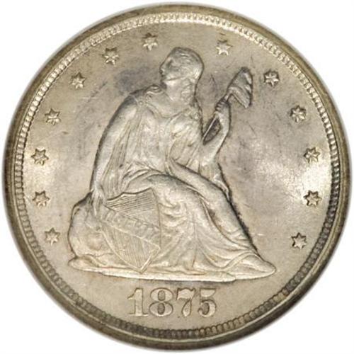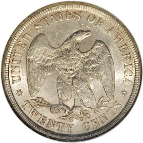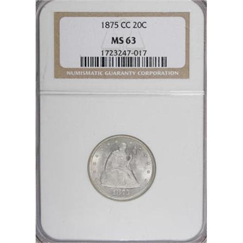 <B>1875-CC 20C MS63 NGC.</B></I> This issue is always popular as the only obtainable Carson City Mint twenty cent piece. This lustrous Select example has attractive light silver-gold patina on each side, with a couple of abrasions--one on Liberty's chin, one above the eagle's head--that define the grade. The strike is quite soft on the eagle's head and left (facing) wing. A good combination of value and attractiveness.<BR><BR><B>Coin Engraver:</B> William Barber<BR><BR><b>Shipping:</b> Coins & Currency (<a target="_blank" href="http://www.heritageauctions.com/common/shipping.php">view shipping information</a>)