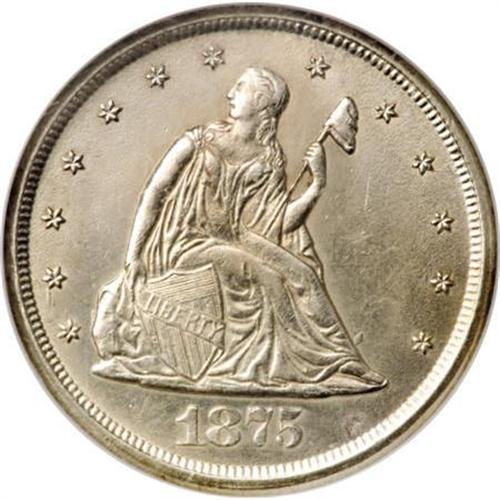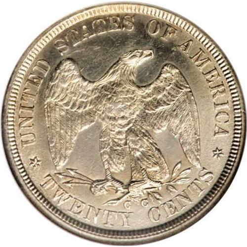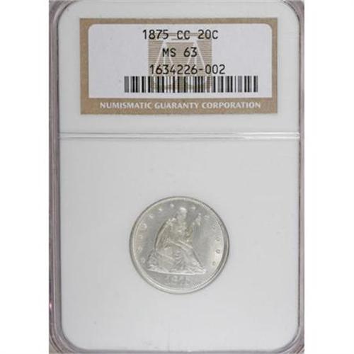 <B>1875-CC 20C MS63 NGC.</B></I> This is a lustrous, bright silver example of the second highest mintage business strike twenty cent piece. A few surface marks are evident, completely in line with the grade. A bit of high point strike weakness is noted on Liberty's torso and the eagle's breast, as usual, but the often weak left (facing) wing is blessed with much better than average detail.<BR><BR><B>Coin Engraver:</B> William Barber<BR><BR><b>Shipping:</b> Coins & Currency (<a target="_blank" href="http://www.heritageauctions.com/common/shipping.php">view shipping information</a>)