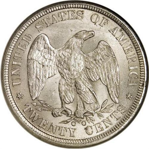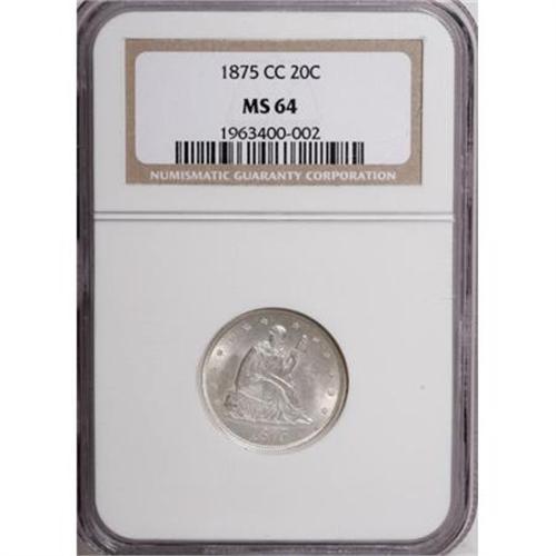 <B>1875-CC 20C MS64 NGC.</B></I> This is an important opportunity, as the 1875-CC 20-cent piece is seldom found with such a strong strike. Typically, examples have the top portion of the left facing wing entirely flat without a single feather visible. However, on this example the details are nearly complete. Both sides have subdued mint frost with subliminal champagne toning.<BR><BR><b>Shipping:</b> Coins & Currency (<a target="_blank" href="http://www.heritageauctions.com/common/shipping.php">view shipping information</a>)