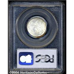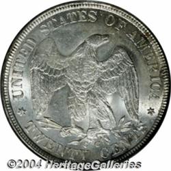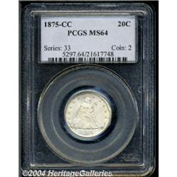 <B>1875-CC<20C> MS64 PCGS.</B></I> The only collectible Carson City Mint twenty-cent piece, with the only other CC issue of this denomination (1876-CC) being a major rarity with only a few more than a dozen known. Therefore, the 1875-CC issue is the only candidate for the Carson City type collector. This near-Gem example has frosty silver luster with splashes of iridescent toning. Typical strike for this issue with most obverse details well defined. The reverse has considerable flatness at the top of the eagle's right wing (to the viewer's left) and on the head. It is seldom that an example is found with these areas showing any design details. Population: 95 in 64, 18 finer (3/04). <BR><BR><B>Important notice:</B> Heritage usually auctions material at the rate of 200-250 lots per hour. On some occasions eBay Live bid software or the Internet may not be able to keep up with the pace of the auction. We recommend placing a realistic absentee bid now as insurance to avoid disappointment. Occasionally the auctioneer may eliminate or reject an eBay Live bid, and the auctioneer may also reopen a lot after the close of the eBay live bidding (usually because we missed an audience bid), and may reject your bid even if it shows you as the winning bidder. By bidding via eBay Live, you agree that Heritage may award the lot to another bidder at its sole discretion under the circumstances described above or any other reasonable circumstances. Since eBay bids are not shown to us until we open the lot on the floor, we treat those bids just like floor bids. In most cases the floor responds before the eBay bid is presented to us, due to Internet lag time, so for consistency we have made it a policy that floor bids are always considered first over tie eBay live bids. Also please note that all Heritage lots purchased through eBay Live carry a 20% Buyer's Premium. Please make sure you read the Terms and Conditions before you bid. </span></font></tr></table></td></tr></table>