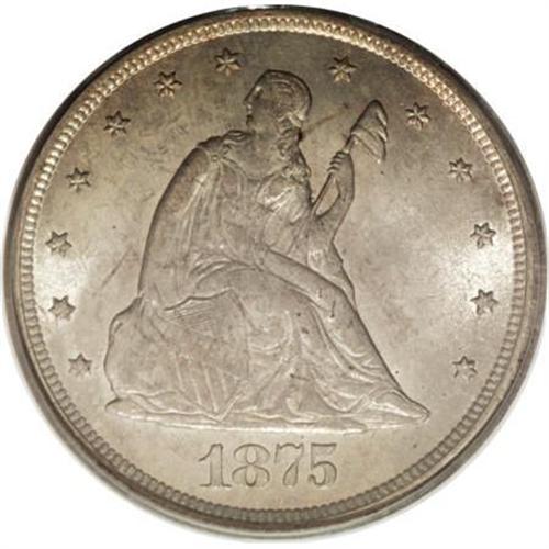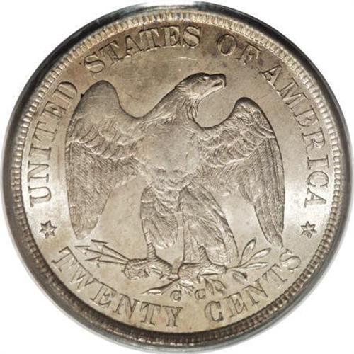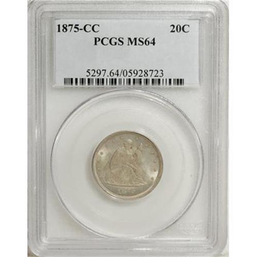 <B>1875-CC 20C MS64 PCGS.</B></I> Paul Green, in a September 2, 2003 <I>Numismatic News</B></I> article, speculates about the rarity of the 1875-CC twenty cent coin. He says: The 20-cent piece was definitely disliked and if it was quickly retired and destroyed, is the 133,290 mintage of the 1875-CC al that reliable, or were many perhaps destroyed, making it tougher than the already low mintage?" Regardless of the answer, MS64 examples of this issue can be difficult to locate. This example displays light golden-gray patina and relatively well struck design elements, save for softness on portions of the eagle. Partial prooflikeness is noted on each side, as are just a few trivial handling marks.<BR><BR><B>Coin Engraver:</B> William Barber<BR><BR><b>Shipping:</b> Coins & Currency (<a target="_blank" href="http://www.heritageauctions.com/common/shipping.php">view shipping information</a>\)