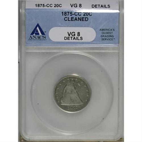 <B>1875-CC 20C --Cleaned--ANACS. VG8 Details.</B></I> NGC Census: (7/414). PCGS Population (12/595). Mintage: 133,290. Numismedia Wsl. Price for NGC/PCGS coin in VG8 : $250. (#5297)<BR><BR><B>Coin Engraver:</B> William Barber<BR><BR><b>Shipping:</b> Coins & Currency (<a target="_blank" href="http://www.heritageauctions.com/common/shipping.php">view shipping information</a>)