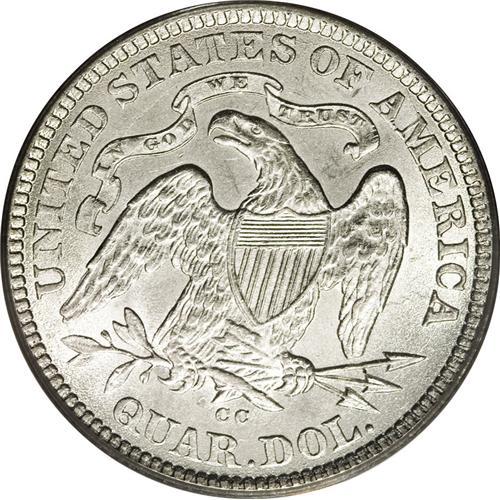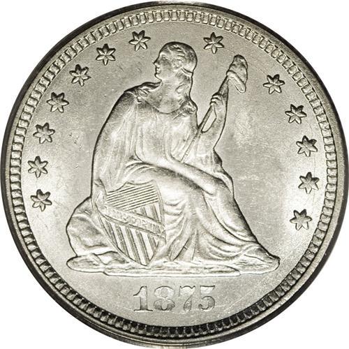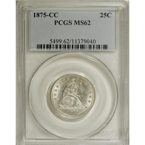 <B>1875-CC 25C MS62 PCGS.</B></I> Type Two Reverse. A lovely frosty sheen emanates from each side of this untoned, silver-white example. A bit weak on the final three obverse stars, the top of Liberty's head, and the eagle's neck feathers; but the other design elements are well defined. A couple of small milling marks are noted that limit the grade. Population: 4 in 62, 11 finer (2/07).<BR><BR><b>Shipping:</b> Coins & Currency (<a target="_blank" href="http://www.heritageauctions.com/common/shipping.php">view shipping information</a>)