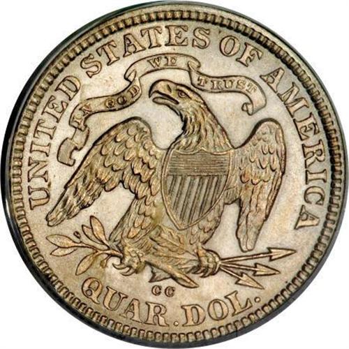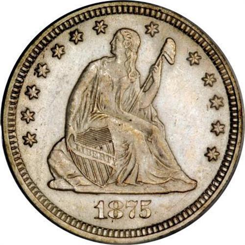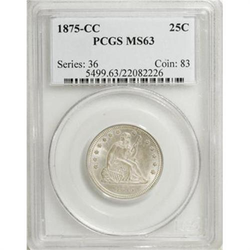 <B>1875-CC 25C MS63 PCGS.</B></I> Despite a seemingly sizable mintage of 140,000 pieces, the 1875-CC quarter rarely crosses the auction block in any grade. This lack of appearances, combined with a misperception of its scarcity and value, makes it a highly underrated issue in the Seated series. Many pricing guides have been slow to acknowledge gains in price made in the last few years; the 2008 <I>Guide Book</B></I>, for example, lists a Select example at just $2,500, a value that seems absurdly low in the context of a recent five-figure result.<BR> In his <I>The Mint on Carson Street</B></I>, Rusty Goe declares that "[p]roperly graded specimens in Fine to MS-63 are most desirable." The lovely exemplar offered here appears at the high end of that scale. Pink and gold accents grace otherwise silver-white surfaces that show whispers of highpoint frost and subtle, satiny luster. Well struck with light, scattered flaws in the fields that preclude a finer designation. Population: 4 in 63, 8 finer (11/07).<BR><BR><B>Coin Engraver:</B> Christian Gobrecht<BR><BR><b>Shipping:</b> Coins & Currency (<a target="_blank" href="http://www.heritageauctions.com/common/shipping.php">view shipping information</a>)