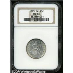 <table><tbody><tr><td><table> <TR><TD width="100%"><TABLE cellSpacing=1 cellPadding=3 width="100%" border=0><TBODY><TR><TD width="100%" bgColor=#79735c><FONT face=arial color=#ffffff size=3><B>Description</B> </FONT></TD></TR><TR><TD width="100%" bgColor=#ffffff><FONT face=arial size=2><B>1875-CC 25C MS65 NGC.</B></I> A scarce, low mintage issue that is an important rarity in the series with Mint State pieces rating a strong R.5 by Larry Briggs. Only three other pieces have been accorded the Gem grade by NGC (11/03) with PCGS having also graded one. The surfaces of this piece are satiny, as usual, and mostly brilliant with just a touch of light color on each side. Fully struck in all areas except for the radials on a couple of the stars. The only mark of note is a horizontal scrape in the right obverse field out from the knee of Liberty.<BR><I>Ex: 1996 ANA Sale (Heritage, 8/96), lot 7086, where it brought $9,075.</B></I><BR><I>From The Dr. Robert Wharton Collection.</B></I> </FONT></TD></TR></TBODY></TABLE></TD></TR></TBODY></TABLE><BR><A name=PricesRealized></A><TABLE cellSpacing=0 cellPadding=0 width="100%" bgColor=#000000 border=0><TBODY><TR><TD width="100%"><TABLE cellSpacing=1 cellPadding=3 width="100%" border=0><TBODY><TR><TD width="100%" bgColor=#79735c><A name=PR><FONT face=arial color=#ffffff size=3><B>Previous Prices from Heritage Auctions</B> </FONT></A></TD></TR><TR><TD bgColor=#f6f6ed><TABLE cellSpacing=0 cellPadding=0 width="100%" border=1><TBODY><TR><TD align=middle width="33%"><B>Date</B></TD><TD align=middle width="33%"><B>Service</B></TD><TD align=middle width="33%"><B>Price</B></TD></TR><TR bgColor=whitesmoke><TD width="33%"><B>08/17/1996</B></TD><TD width="33%">PCGS</TD><TD width="33%">$9,075.00</TD></TR></TBODY></TABLE></TD></TR><TR><TD bgColor=#ffffff><FONT face=arial size=1 ?>PLEASE NOTE: All prices realized reflect the final hammer price PLUS the buyer's premium in auctions that charge a buyer's premium. Each item has a notation at the top of the listing indicating whether that lot included a buyer's premium. Example: A item that sells with a final hammer price of $100 and a 20% buyer's premium will display with a price realized of $120. All information listed is intended to be as accurate as possible, but errors are possible. Please use this guide carefully and inform us of any inaccuracies. </FONT></TD></TR></TBODY></TABLE></TD></TR></TBODY></TABLE><BR><TABLE cellSpacing=0 cellPadding=0 width="100%" bgColor=#000000 border=0><TBODY><TR><TD width="100%"><TABLE cellSpacing=1 cellPadding=3 width="100%" border=0><TBODY><TR><TD width="100%" bgColor=#79735c colSpan=6><FONT face=arial color=#ffffff size=3><B>Price Guide*</B> </FONT></TD></TR><TR bgColor=#f6f6ed><TD align=middle><B>Grade</B> </TD><TD align=middle><B>Coin World<BR>(Trends)</B> </TD><TD align=middle><B>Numismedia<BR>Retail</B> </TD><TD align=middle><B>Numismedia<BR>Wholesale</B> </TD><TD align=middle><B>Coin<BR>Universe</B> </TD><TD align=middle><B>Heritage<BR>Value Index</B> </TD></TR><TR bgColor=#ffffff><TD align=middle>64</TD><TD align=right>$5,000.00</TD><TD align=right>---</TD><TD align=right>$2,950.00</TD><TD align=right>$4,875.00</TD><TD align=right>$3,245.63</TD></TR><TR style="FONT-WEIGHT: bold" bgColor=#cccfdd><TD align=middle>65</TD><TD align=right>---</TD><TD align=right>---</TD><TD align=right>---</TD><TD align=right>---</TD><TD align=right>$9,000.00</TD></TR><TR bgColor=#ffffff><TD align=middle>66</TD><TD align=right>---</TD><TD align=right>---</TD><TD align=right>---</TD><TD align=right>---</TD><TD align=right>---</TD></TR><TR bgColor=#ffffff><TD colSpan=6><FONT size=1>*All information listed is intended to be as accurate as possible, but errors are possible. No item may be returned or refused based on this information which is provided as a service to our customers. You should contact each pricing source directly to determine the accuracy of this information. </FONT></TD></TR></TBODY></TABLE></TD></TR></TBODY></TABLE><BR><TABLE cellSpacing=0 cellPadding=0 width="100%" bgColor=#000000 border=0><TBODY><TR><TD width="100%"><TABLE cellSpacing=1 cellPadding=3 width="100%" border=0><TBODY><TR><TD width="100%" bgColor=#79735c><FONT face=arial color=#ffffff size=3><B>Population Guide</B> </FONT></TD></TR><TR bgColor=#ffffff><TD align=middle><!-- Begin Output of Population Grid--><TABLE cellSpacing=0 cellPadding=0 width="100%" border=0><TBODY><TR><TD vAlign=center><TABLE cellSpacing=0 width="100%" border=1 cellsadding="3"><TBODY><TR><TD vAlign=center><TABLE cellSpacing=0 cellPadding=3 width="100%" border=1><TBODY><TR><TD vAlign=center align=middle bgColor=#f0f1e8 colSpan=2 <CENTER><FONT face=Arial size=2><B>PCGS Pop </B></FONT><CENTER></CENTER></TD><TD vAlign=center align=middle bgColor=#f0f1e8 colSpan=2><CENTER><FONT face=Arial size=2><B>NGC Pop</B></CENTER></FONT></TD></TR><TR><TD vAlign=center><FONT face=Arial size=2>(65)</FONT> </TD><TD vAlign=center align=right><FONT face=Arial size=2>1</FONT> </TD><TD vAlign=center><FONT face=Arial size=2>(65)</FONT> </TD><TD vAlign=center align=right><FONT face=Arial size=2>4</FONT> </TD></TR><TR><TD vAlign=center><FONT face=Arial size=2>(>65)</FONT> </TD><TD vAlign=center align=right><FONT face=Arial size=2>0</FONT> </TD><TD vAlign=center><FONT face=Arial size=2>(>65)</FONT> </TD><TD vAlign=center align=right><FONT face=Arial size=2>0</FONT> </TD></TR></TBODY></TABLE></TD></TR></TBODY></TABLE></TD></TR></TBODY></TABLE><!-- End Output of Population Grid--></TD></TR></TBODY></TABLE></TD></TR></TBODY></TABLE><BR><TABLE cellSpacing=0 cellPadding=0 width="100%" bgColor=#000000 border=0><TBODY><TR> <font color='#000000'><span style='background-color: #FFFFFF'><td bgcolor='#FFFFFE'> Important notice: Heritage usually auctions material at the rate of 200-250 lots per hour. On some occasions eBay Live bid software or the Internet may not be able to keep up with the pace of the auction. We recommend placing a realistic absentee bid now as insurance to avoid disappoint