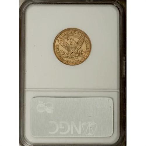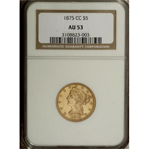 <B>1875-CC $5 AU53 NGC.</B></I> There is ample luster in the protected areas of this bright, rich-gold five. A predictably elusive issue with a low mintage of just 11,828 pieces, the majority of which are found in XF or lower states of preservation. The obverse is better struck than most peer examples (with some weakness on the hair curls), and the eagle's neck is ill-defined on the reverse. A few light marks scattered about do not distract and the overall appeal is very nice. Census: 12 in 53, 16 finer (12/07).<BR><BR><B>Coin Engraver:</B> Christian Gobrecht<BR><BR><b>Shipping:</b> Coins & Currency (<a target="_blank" href="http://www.heritageauctions.com/common/shipping.php">view shipping information</a>)