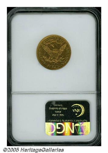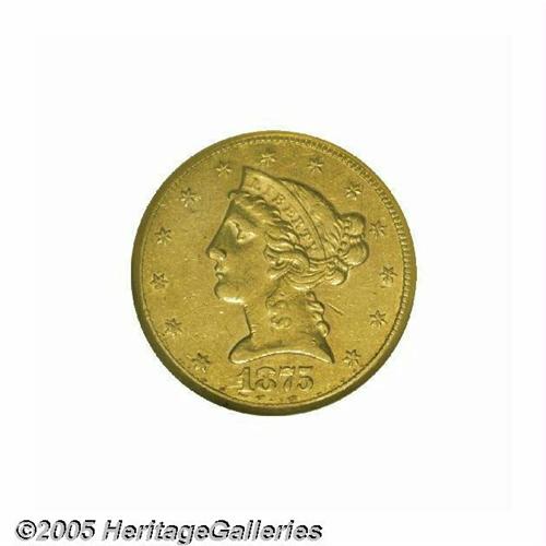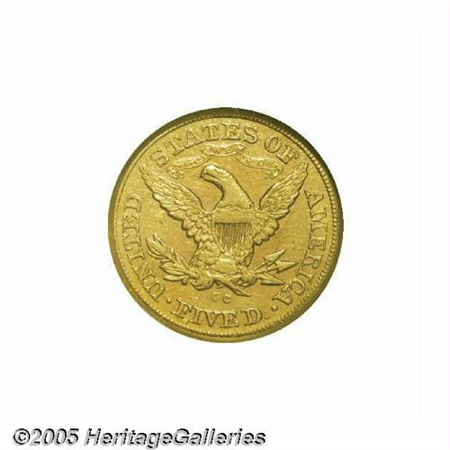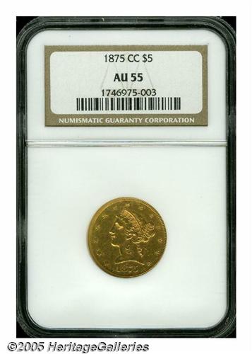 <B>1875-CC<$5> AU55 NGC.</B></I> A predictably elusive Carson City Half Eagle, one of just 11,828 pieces struck, that saw heavy 19th century demand and is rarely encountered today above the XF grade level. This outstanding example is copper-gold in color with much surviving luster over moderately abraded surfaces. The obverse is better struck than most (with some weakness on the hair curls), but the neck and leg of the eagle are typically ill-defined on the reverse. We note an abrasion behind Liberty's neck and one in the left reverse field under the eagle's wing, these being points of attribution more so than distractions. Population: 7 in 55, 5 finer (6/05).
