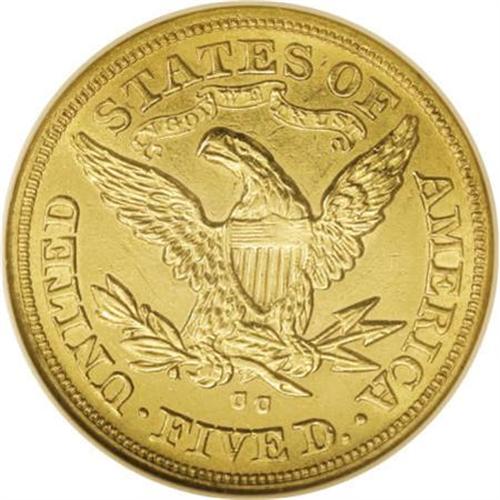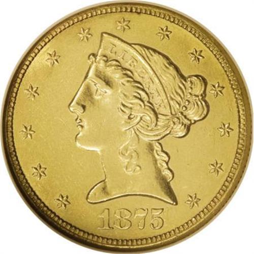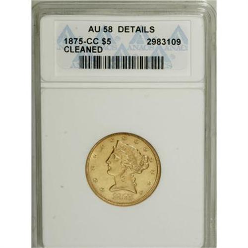 <B>1875-CC $5 --Cleaned--ANACS. AU58 Details.</B></I> Sharply struck for the Carson City Mint, with softness limited to the eagle's shield. A careful wipe from a jeweler's cloth has left this representative slightly bright, but the only remotely mentionable mark is faded and relatively concealed beneath the scroll. The 1875-CC has a low mintage of 11,828 pieces, and many of the hundred-plus survivors are heavily worn. PCGS and NGC have each certified an example as AG3. Only two 1875-CC half eagles have been certified as Mint State by either NGC or PCGS, an MS61 PCGS and an MS63 NGC. Since those two pieces are out of reach for any collector left out of the Sam Walton estate, this smooth and momentarily circulated example will serve as a high grade substitute.<BR><BR><B>Coin Engraver:</B> Christian Gobrecht<BR><BR><b>Shipping:</b> Coins & Currency (<a target="_blank" href="http://www.heritageauctions.com/common/shipping.php">view shipping information</a>\)