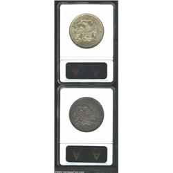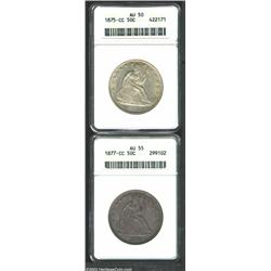 1875-CC 50C AU50 ANACS, nicely struck with abundant luster and hints of gold patina, HALF DOL is strike doubled; and an 1877-CC AU55 ANACS, WB-103, medium mintmark, deep lavender patina, well struck, the surfaces are refreshingly unabraded.From the Ohio Collection. 2 coins Important notice: We expect to be auctioning lots at the rate of 200-250 per hour. Sometimes eBay Premier live bid software cannot keep up with that pace, so we strongly recommend that you place a realistic proxy bid now as insurance to avoid disappointment. Also please note that all Heritage/CAA lots purchased through eBay Premier carry a 20% Buyer's Premium. Please make sure you read the Terms and Conditions.