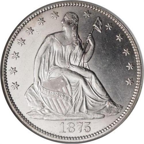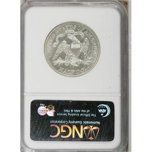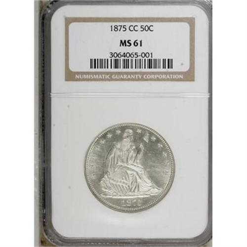 <B>1875-CC 50C MS61 NGC.</B></I> A brilliant and satiny Carson City half. The strike is above average, with only minor incompleteness on the eagle's left (facing) ankle and the leftmost scroll letters. The reverse is surprisingly unabraded, and the obverse is also smooth despite a couple of faint marks on the left field. Census: 9 in 61, 51 finer (11/07).<BR><BR><B>Coin Engraver:</B> Christian Gobrecht<BR><BR><b>Shipping:</b> Coins & Currency (<a target="_blank" href="http://www.heritageauctions.com/common/shipping.php">view shipping information</a>)
