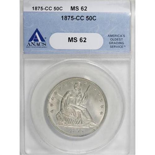 <B>1875-CC 50C MS62 ANACS.</B></I> A fully struck example of this popular CC type coin. Lightly toned on the obverse; the reverse is significantly deeper in hue.<BR><BR><B>Coin Engraver:</B> Christian Gobrecht<BR><BR><b>Shipping:</b> Coins & Currency (<a target="_blank" href="http://www.heritageauctions.com/common/shipping.php">view shipping information</a>)