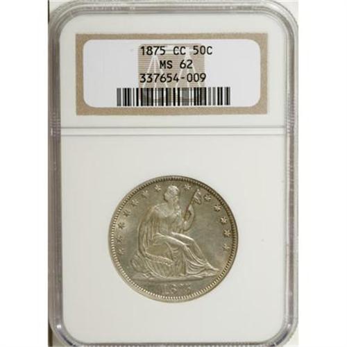 <B>1875-CC 50C MS62 NGC.</B></I> Lustrous surfaces exhibit traces of light olive-green and sharply struck devices. A few minute contact marks are scattered about, and what appears to be a light fingerprint is visible in the upper left obverse quadrant.<B><BR></B></I><I>From The Beau Clerc Collection.</B></I><BR><BR><B>Coin Engraver:</B> Christian Gobrecht<BR><BR><b>Shipping:</b> Coins & Currency (<a target="_blank" href="http://www.heritageauctions.com/common/shipping.php">view shipping information</a>)