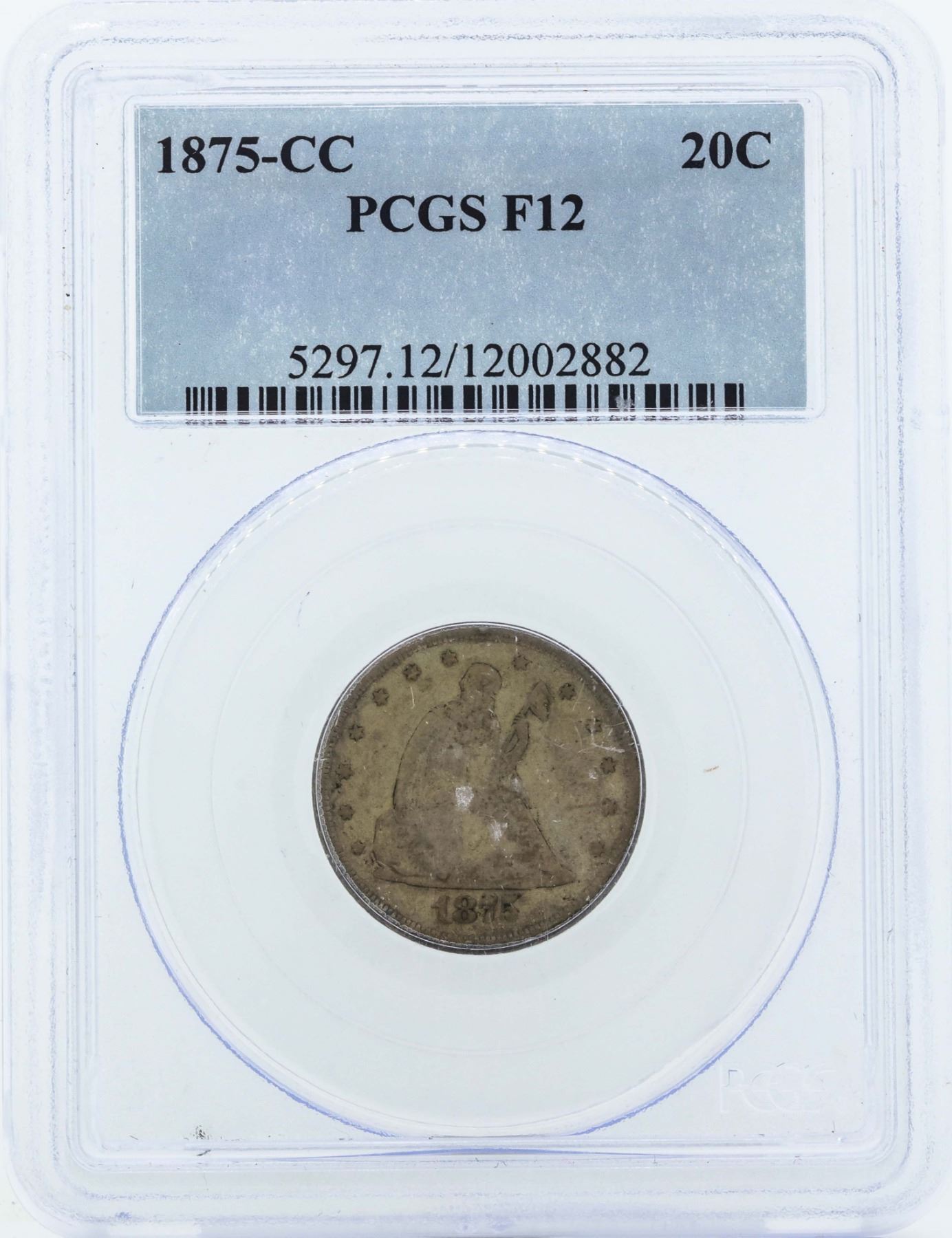 One 1875-CC Seated Liberty Twenty Cent Piece Coin PCGS F12.