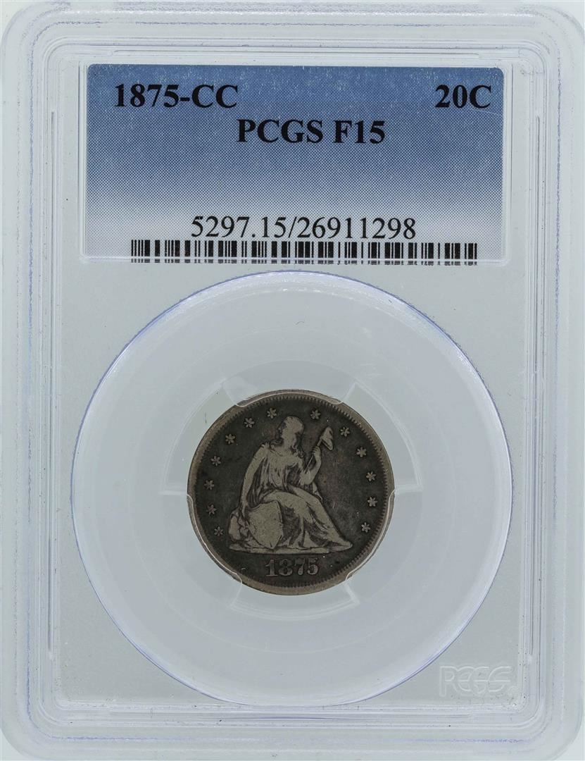 One 1875-CC Seated Liberty Twenty Cent Piece Coin PCGS F15. PCGS Certified.