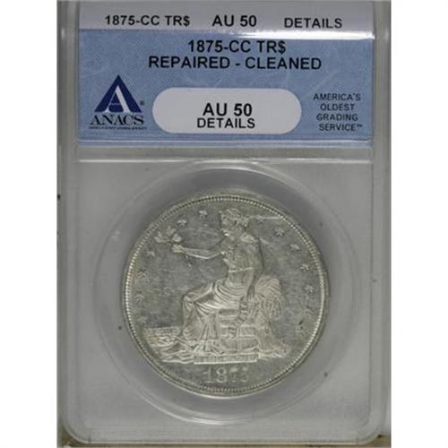 <B>1875-CC T$1 --Cleaned, Repaired--ANACS. AU50 Details.</B></I> NGC Census: (5/184). PCGS Population (20/218). Mintage: 1,573,700. Numismedia Wsl. Price for NGC/PCGS coin in AU50: $475. (#7038)<BR><BR><B>Coin Engraver:</B> William Barber<BR><BR><b>Shipping:</b> Coins & Currency (<a target="_blank" href="http://www.heritageauctions.com/common/shipping.php">view shipping information</a>)