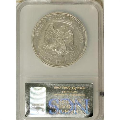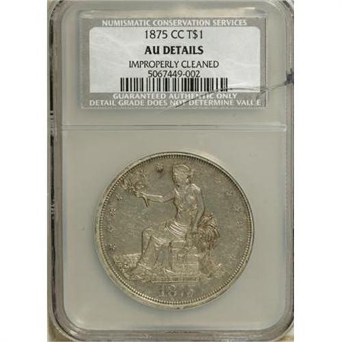 <B>1875-CC T$1 --Improperly Cleaned--NCS. AU Details.</B></I> NGC Census: (5/184). PCGS Population (20/218). Mintage: 1,573,700. Numismedia Wsl. Price for NGC/PCGS coin in AU50: $475. (#7038)<BR><BR><B>Coin Engraver:</B> William Barber<BR><BR><b>Shipping:</b> Coins & Currency (<a target="_blank" href="http://www.heritageauctions.com/common/shipping.php">view shipping information</a>)