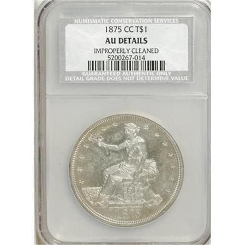 <B>1875-CC T$1 --Improperly Cleaned--NCS. AU Details.</B></I> NGC Census: (0/0). PCGS Population (0/0). Mintage: 1,573,700. (#7038)<BR><BR><B>Coin Engraver:</B> William Barber<BR><BR><b>Shipping:</b> Coins & Currency (<a target="_blank" href="http://www.heritageauctions.com/common/shipping.php">view shipping information</a>)