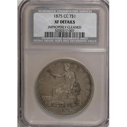 <B>1875-CC T$1 --Improperly Cleaned--NCS .XF Details.</B></I> NGC Census: (0/0). PCGS Population (0/0). Mintage: 1,573,700. (#7038)<BR><BR><B>Coin Engraver:</B> William Barber<BR><BR><b>Shipping:</b> Coins & Currency (<a target="_blank" href="http://www.heritageauctions.com/common/shipping.php">view shipping information</a>)